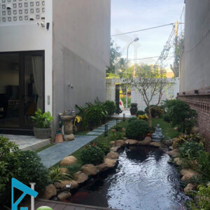 Sân vườn sẽ được trồng cỏ toàn bộ, lối đi được sắp xếp bởi những viên gạch có cùng kích thước. Hết lối đi là khoảng sân nhỏ nằm kề bên Hồ cá Koi cho gia đình vừa có không gian sinh hoạt vừa có thể thư giãn.