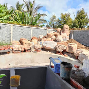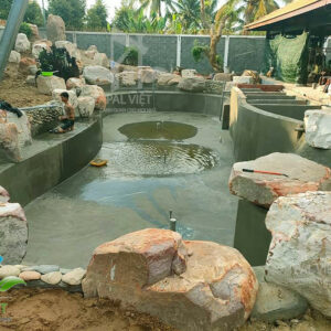 Những tảng đá lớn tạo hình cho hồ Koi. Khu vực thác nước cũng đang được tạo hình
