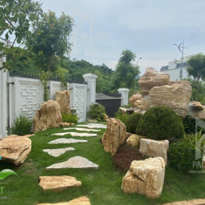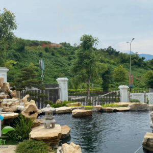 Trải qua thời gian thi công miệt mài, ngoại cảnh ngôi biệt thự đã được khoác áo mới. Với nét đặc sắc là những phiến đá to nhỏ nổi bật trên nền cỏ xanh. Khu vực hồ Koi rộng không quá cầu kỳ, những nét đơn giản như thế được sắp xếp một cách có chủ ý. Tất cả tạo ra một không gian hài hòa với phong cảnh núi đồi Lào Cai.