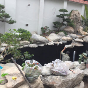 Giai đoạn sắp hoàn thiện hình dáng hồ. Những viên đá cuội và tiểu cảnh đã đang được sắp xếp và tiến đến giai đoạn cuối cùng.
