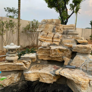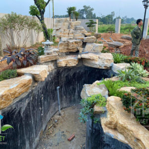 Tạo hình dáng hồ uốn lượn xung quanh là những tảng đá cổ thạch màu vàng ấn tượng. Thác nước cũng được chăm chút tỉ mỉ từng chi tiết.