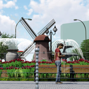 Đài phun nước và cối xay gió là điểm nhấn sống động cho không gian