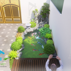 Diện tích khoảng sân khá hạn hẹp,chỉ vỏn vẹn khoảng 10m2.Tạo một không gian hồ cá koi nhỏ nhưng vẫn có núi non,cây cỏ tự nhiên và không gian ngồi uống trà ngắm cá.