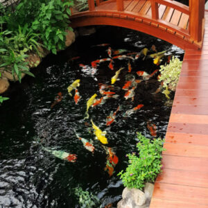 Toàn cảnh không gian hồ koi,có thác và đá bo bờ làm bằng đá cuội.Sử dụng sàn gỗ tự nhiên làm không gian ngồi ngắm cá thật hoàn hảo.Cây Tùng la hán lớn và cầu gỗ cũng là một điểm nhấn không thể thiếu trong bức tranh đẹp này.