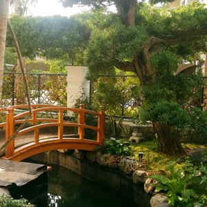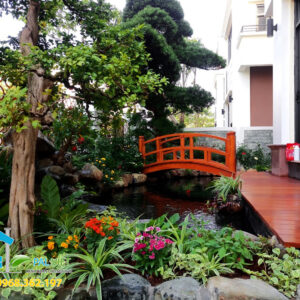 Ở dự án thiết kế lần này, Cảnh quan Pal Việt đã thiết kế một chiếc cầu nhỏ, không quá cao tạo nên nét gần gũi, hoà hợp với thiên nhiên,một cây tùng la hán lớn và giá trị cũng là điểm nhấn đặc biệt cho công trình.