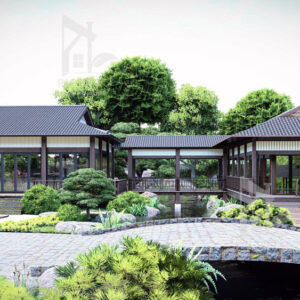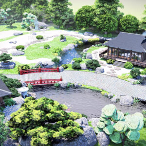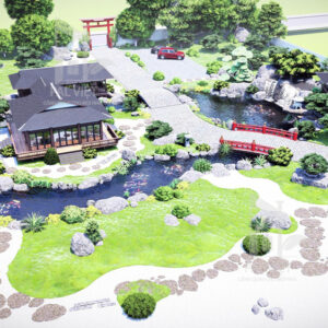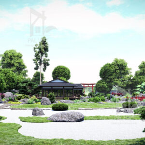 Không gian cảnh quan chuẩn Nhật,vừa bước vào là cổng đặc trưng của vườn Nhật,có không gian bãi đỗ xe ô tô và một tuyến đường trục chính vào sâu công trình.Với thiết kế hồ cá Koi chạy quanh 3 lầu trà ,từ vị trí lầu trà này có thể thuận tiện ngắm nhìn không gian xung quanh của khu vườn Nhật này.Sự đan xen hài hòa giữa các mảng xanh là cỏ và không gian vườn sỏi khô,hơn hết là sự kết nối các không gian với nhau bằng các tuyến đường dạo đá tự nhiên giúp chúng ta có thể thỏa sức khám và khu vườn này một cách dễ dàng.