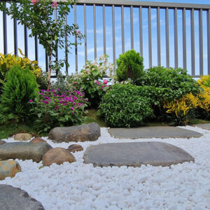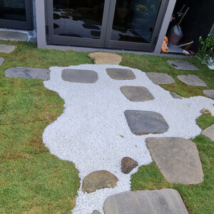 Những viên sỏi trắng không chỉ tạo điểm nhấn, chia không gian sân vườn thành từng khu vực khác nhau mà còn có tác giác dụng massage khi đi chân trần.