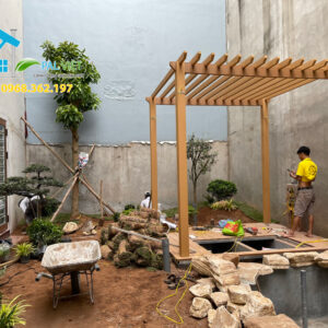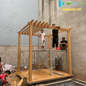 Công đoạn làm giàn lam gỗ nhựa mái che cũng đang dần hoàn thiện.