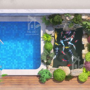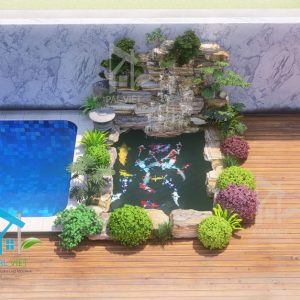 Bên cạnh không gian hồ cá koi là bể bơi sẵn có của gia đình.