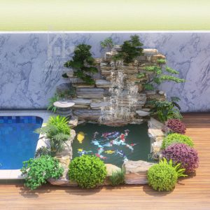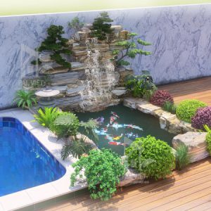 Tổng diện tích là 10m2 anh và gia đình mong muốn có một không gian hồ cá Koi đá cổ thạch,thác nước cao. Qua trao đổi chúng tôi phác thảo 3D cho gia đình anh.