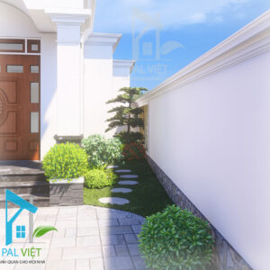 Không gian lối đi được kết hợp cây bụi,thảm cỏ đá bước dạo và một bức phù điêu vừa là không gian kết nối vừa là view nhìn đẹp từ phòng khách nhìn ra.